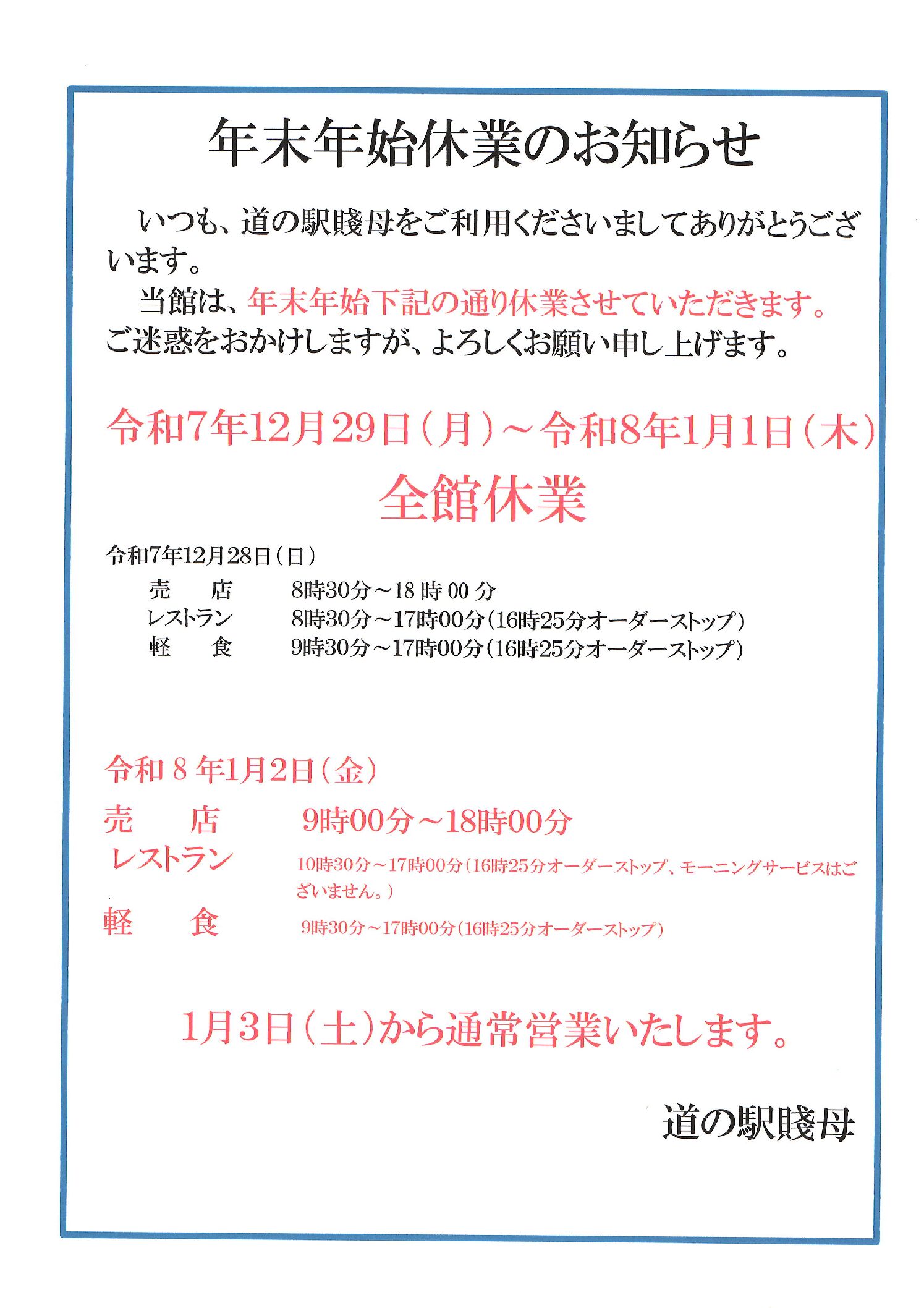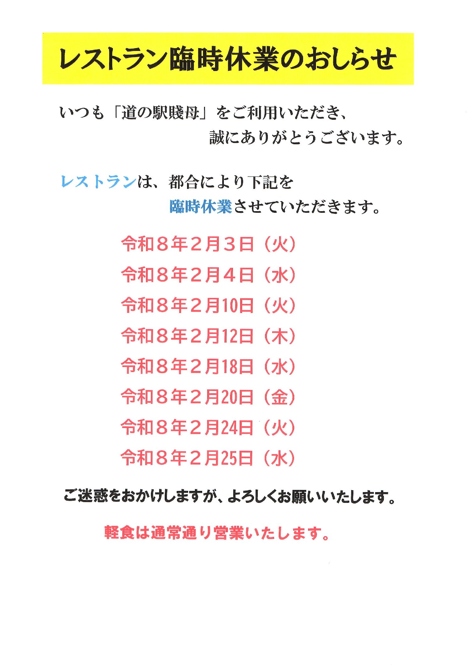 日頃から「道の駅賤母」をご利用いただきありがとうございます。 「山口農産物等直売組合」では、この地域(山口・馬籠・南木曽・坂下)でとれた、朝取りの新鮮野菜を取り揃え販売しています。 木曽方面(国道19号線)にお越しの節...